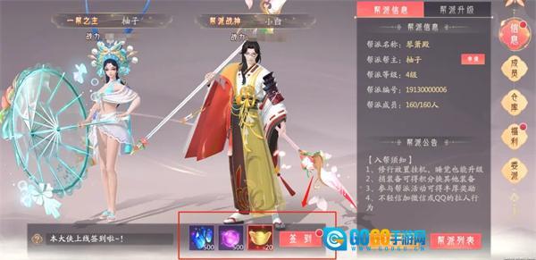 首先是帮派签到环节,加入帮派之后,各位每天都能在帮派里完成签到操作,这样就能拿到元宝奖励和仓库积分啦~之后仓库积分还能用来在仓库兑换自己需要的装备,这可是免费获取的元宝,大家赶紧来签到领取吧!