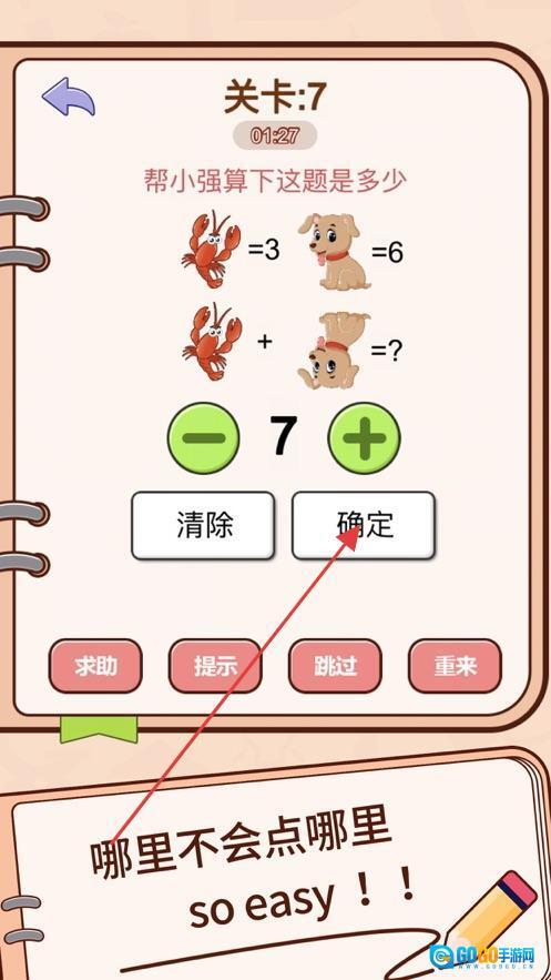 3、碰到数学类题目(例如设定龙虾代表3、小狗代表6,计算两者之和),需要输入对应的结果(即9),随后点击“确定”按钮,以此推进关卡进度并领取相应奖励。