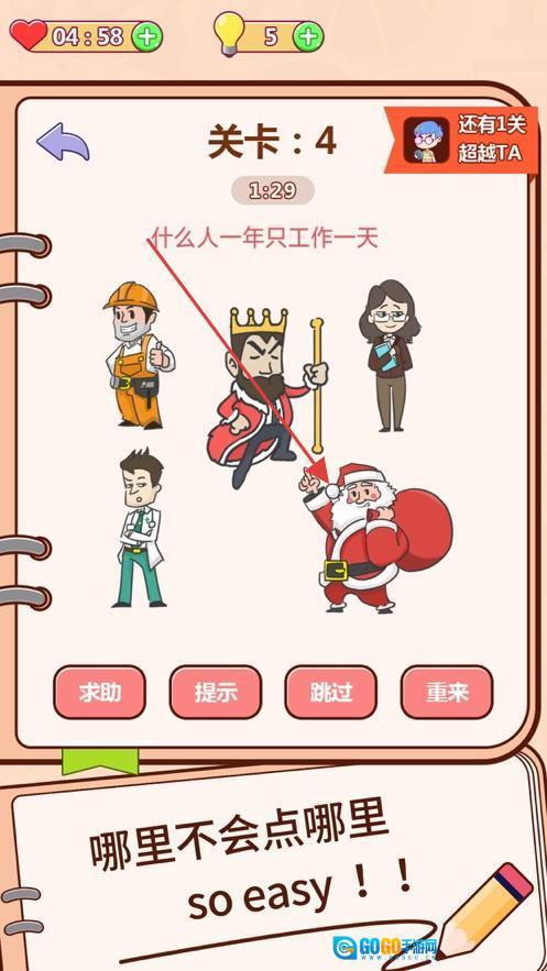 2、在关卡中,依据题目(例如“什么人一年只工作一天”),点击与之对应的答案(圣诞老人),即可完成该题的作答。