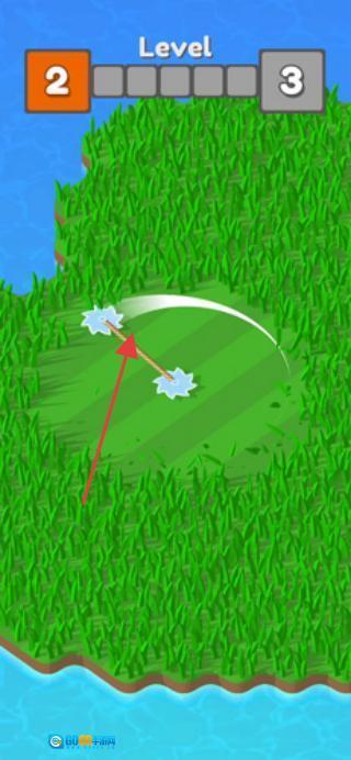 1、进入游戏界面后,按照红色箭头的指示,操控工具进行割草操作,过程中注意避开水域,直至填满进度条的橙色部分。