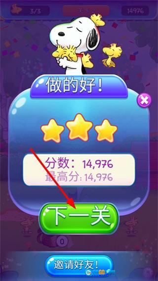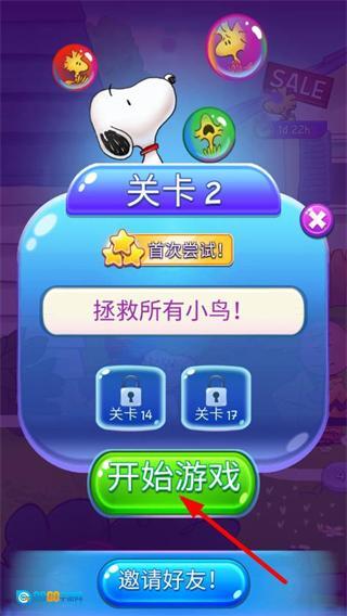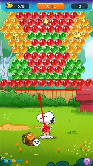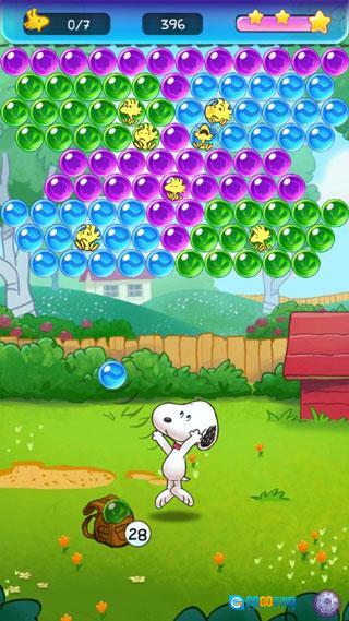 你需要操控史努比发射对应颜色的泡泡,只要让它和上方同色泡泡连成三个及以上就能消除。游戏目标是解救被泡泡困住的小鸟,完成关卡要求的救援数量就能顺利通关。
