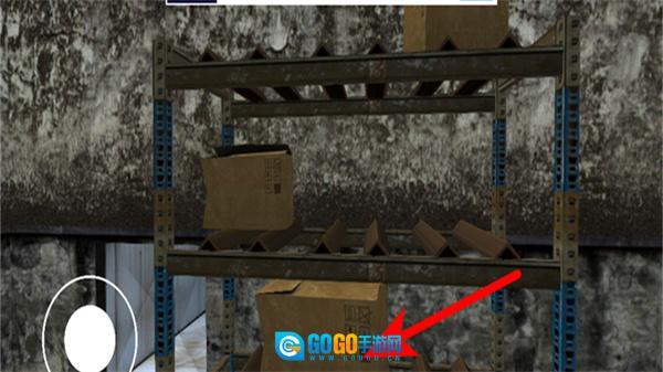 4、移动至货架旁边,点击箭头所指的纸箱,以此触发打开纸箱的操作,从而获取隐藏的道具或线索,推动游戏探索的进程。