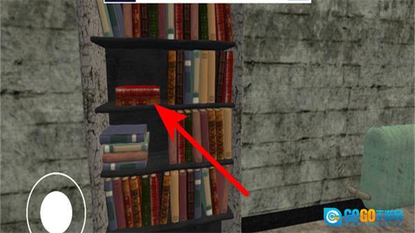 3、前往书架区域,点击箭头所指的红色书籍,收集该物品,它或许是后续解谜的关键道具。