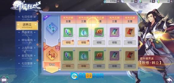 2、参与开服狂欢“送韩立”活动,不仅能助力提升自身修为,累计下来还可免费获取至少上千灵石。若条件允许,开通至臻礼包,更能额外获得双倍灵石奖励。
