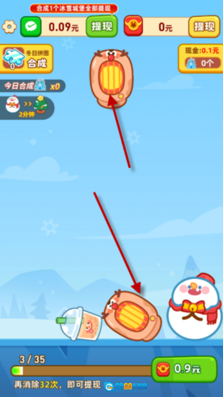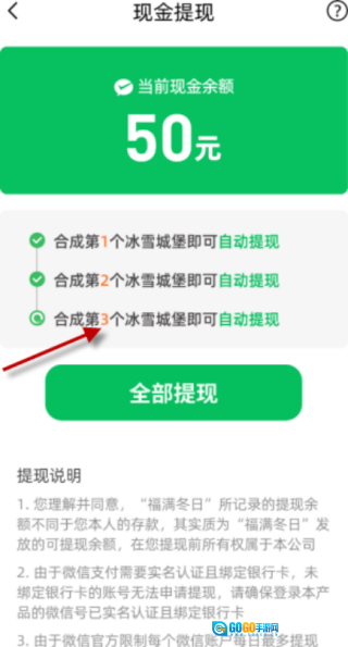 每次合成冰雪城堡都能得到提现机会,前两次会特别简单,越往后难度就越大,对应的奖励也会更丰厚。