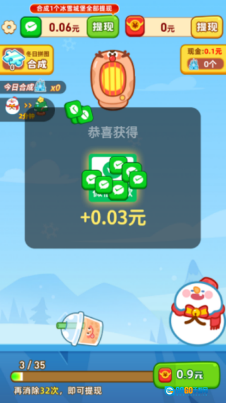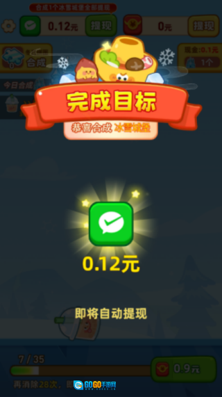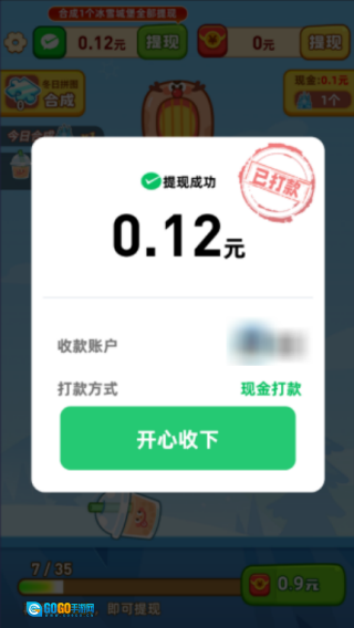 每次合成冰雪城堡都能得到一次提现机会,这次直接提现了0.12。
