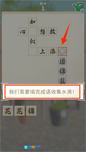 3、要是水不够用了,就得完成成语谜题来收集水滴。