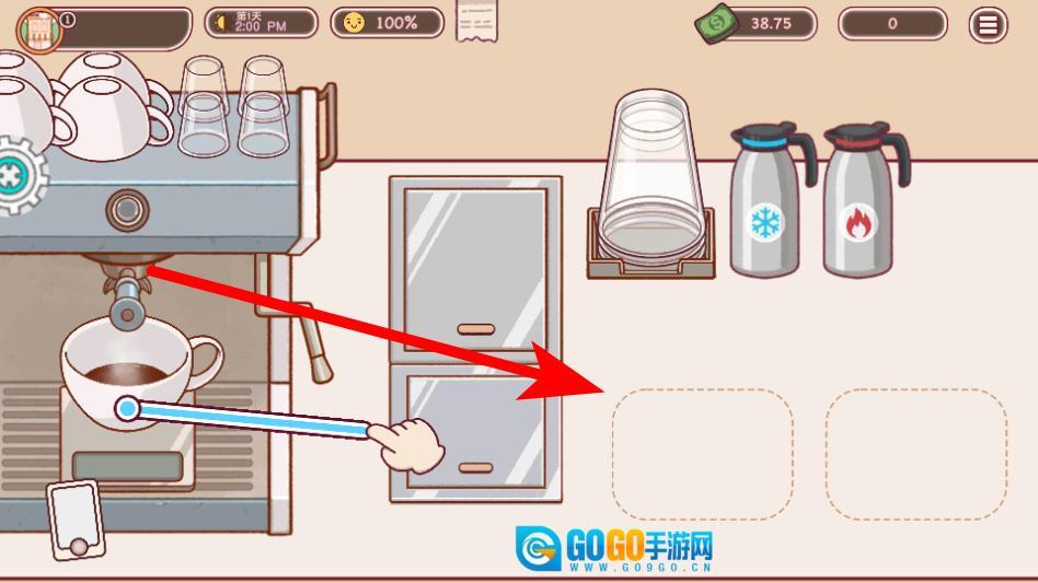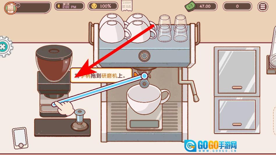 3、依照指引把手柄拖至研磨机处,开启咖啡研磨流程,以此为浓缩咖啡的制作做好准备。