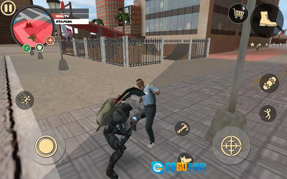 游戏界面里的图标与按钮功能如下:左侧从上往下排列着地图、奔跑、移动等按钮;右侧从上往下依次是能量显示、血量显示、上车、跳跃、绳索、攻击和脚踢功能。另外,通过手指滑动屏幕还能实现视角控制。
