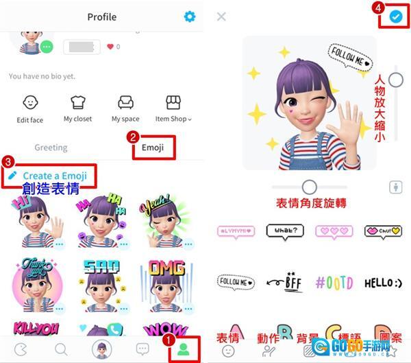 ▼【➀个人资料】→【➁表情】→【➂创造表情】→【➃确认】