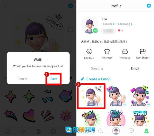 ▼【➀ Save 储存】→【➁自己制作的表情贴就会显示出来啦】