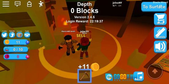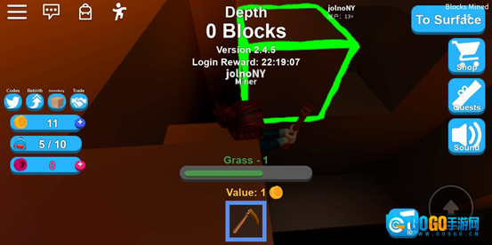 刚开始的时候,我们可以得到初始的两件装备——木镐和一个能装10件物品的背包。我们拿着木镐去挖矿,等背包装满了就把矿石卖掉换成金币,接着用这些金币去买更厉害的木镐和容量更大的背包,这样就能让金币的获取速度变快,靠着手里现有的这些道具让自己变得有钱起来!