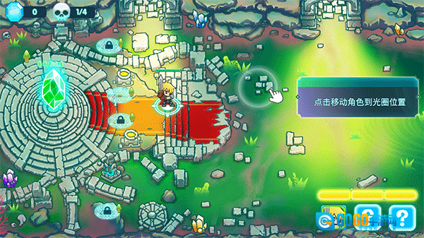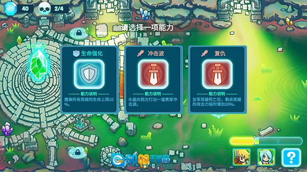 每击败一波怪物就能解锁一项能力,点击英雄就能选中该英雄执行操作。