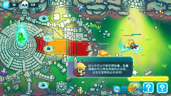 战斗过程中能够持续积累能量,当能量槽填满后,就能施展英雄的必杀技,点击此处来释放必杀技吧!