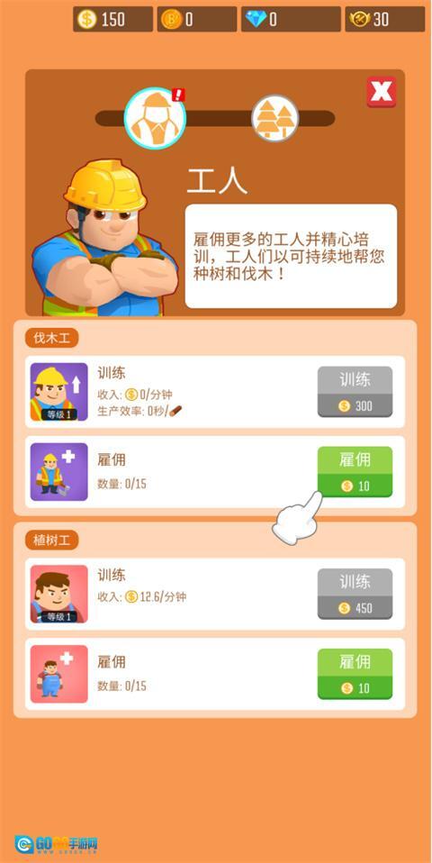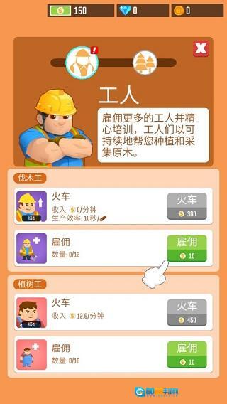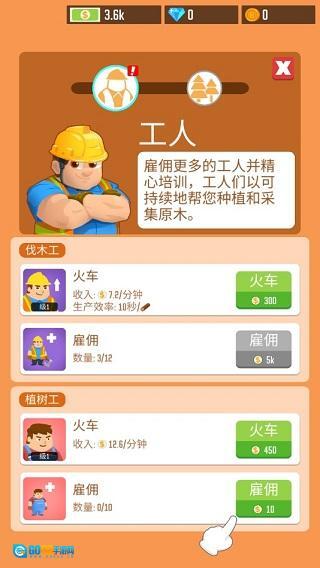 树木没办法自行生长,用同样的操作方式,点击原木区域就能打开工人雇佣界面,在这个界面里雇佣植树工就能用来培育森林,如此一来你就能获得源源不断的原木了!