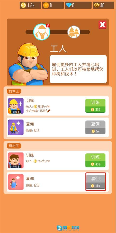 雇佣更多工人并进行精心培训,他们就能持续为您种植和采集原木。在这里,玩家能看到伐木工与植树工,两者的雇佣费用有所不同,接下来我们先雇佣一名伐木工吧!