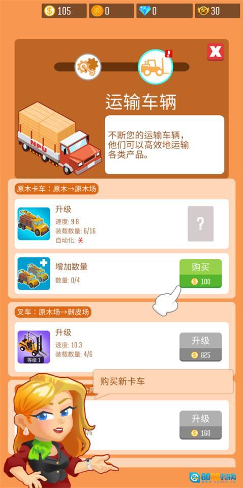 原材料已经准备就绪,目前就差运输工具了。请按照手指箭头指示的位置,购买原木卡车用于运输原木。