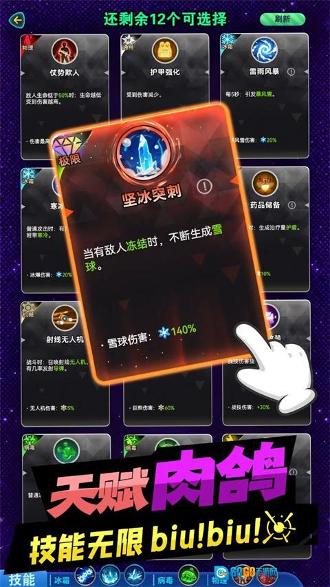 每次升级会出现随机技能提升,上百种技能组合,永远停不下来。