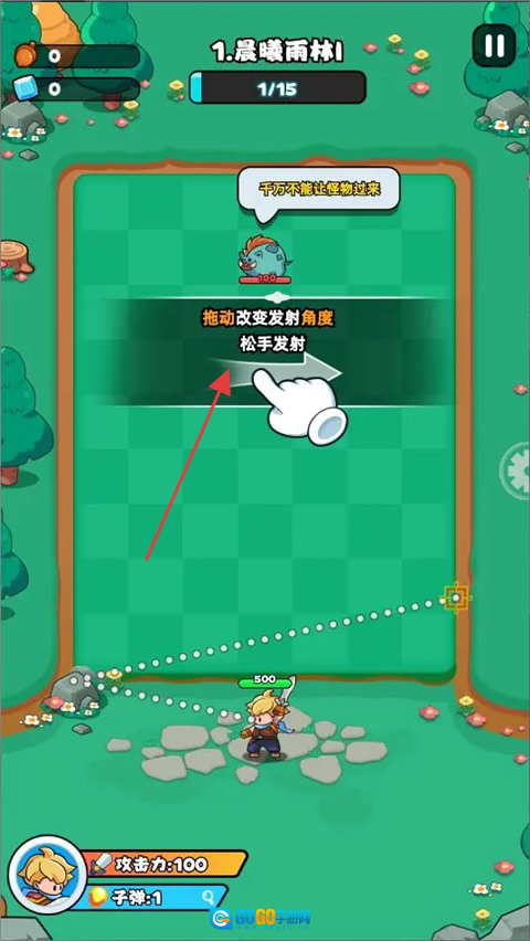2、在战斗中,按照提示【拖动改变发射角度松手发射】,攻击怪物,阻止其靠近。