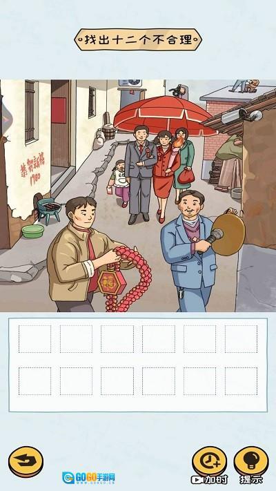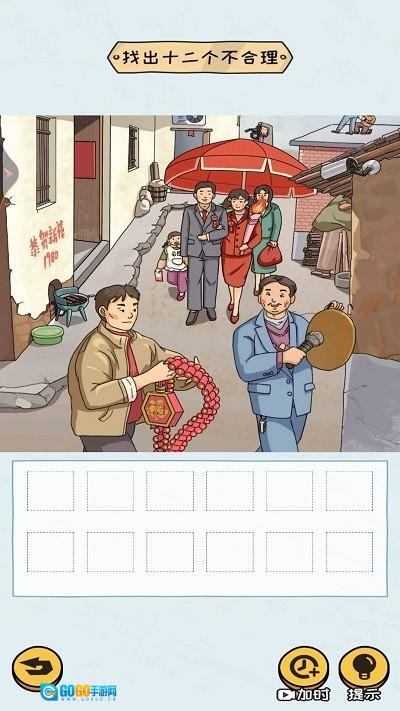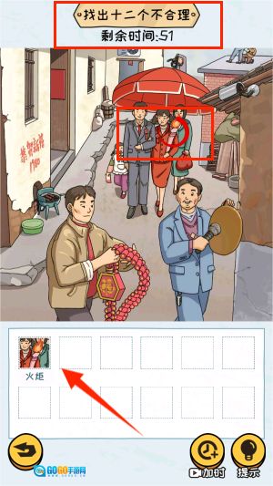 3、进入关卡后,游戏任务是找出12处不合理的地方。你要仔细观察图片,点击不合理的地方将其圈出,记得留意时间限制哦。
