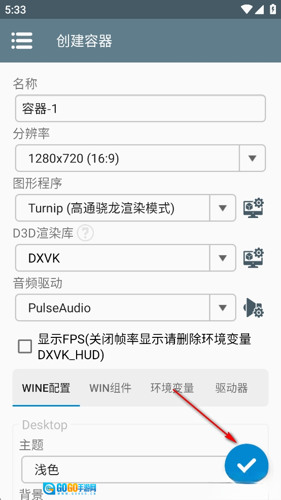 选择屏幕分辨率,以及设定显存大小(配置较低的手机显存和分辨率要小点),点击勾创建容器