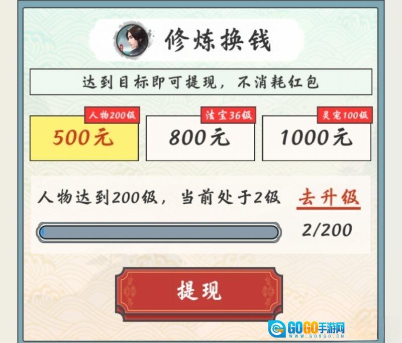 提现500元需要人物等级达到200级,提现800元的条件是游戏法宝等级够36级,提现1000元要求是游戏灵宠等级达到100级。