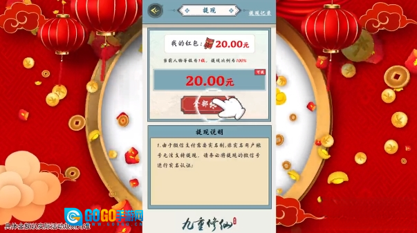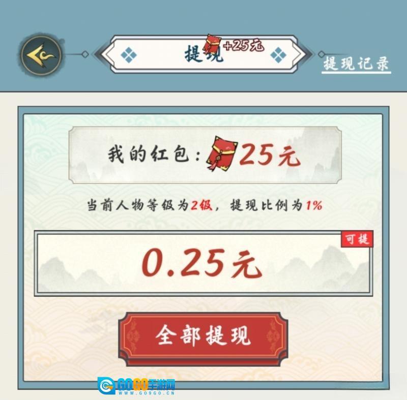 按照游戏中的提示,九重修仙游戏人物等级越高,可提现比例越高。在1-24级之前都是1%提现比例,到了190-219级提现比例就变成了10%,有了明显的突破。当然大家千万不要存红包,毕竟需要提现一次才会刷新最新的兑换比例。