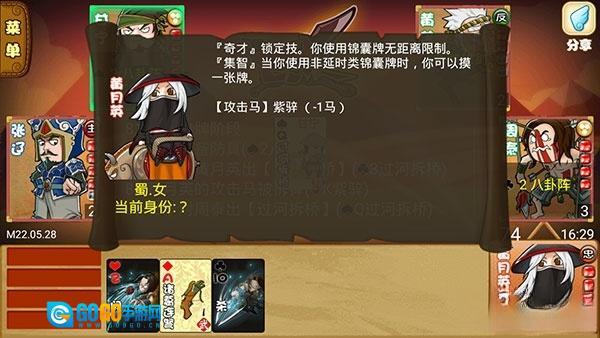 这段文本可以修改为: “该游戏采用高智能AI设计,支持灵活的随机参数设置。提供丰富的游戏模式,包括1V1、3V3、五人身份局、八人身份局、虎牢关、曹操传、国战及KOF等。同时,还具备点将、双将、点身份、武将DIY等多样化功能,并兼容蚂蚁扩展包与E鸣惊人武将包。”