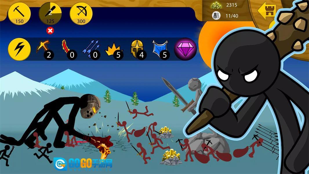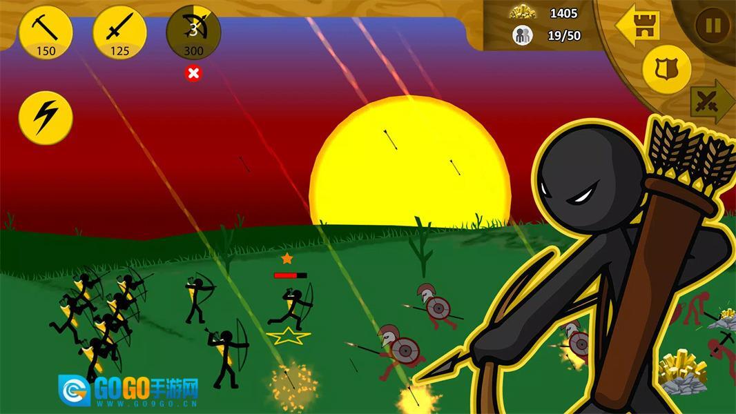 2.深度资源管理系统:黄金是训练军队的核心资源,玩家需平衡矿工数量与士兵保护。初期建议训练2-3名矿工快速积累资金,中期根据敌方兵种调整训练比例(如面对弓箭手优先增加矛士)。游戏还提供升级系统,提升矿工开采速度、剑士攻击力、弓箭手射程等属性,强化部队综合实力。