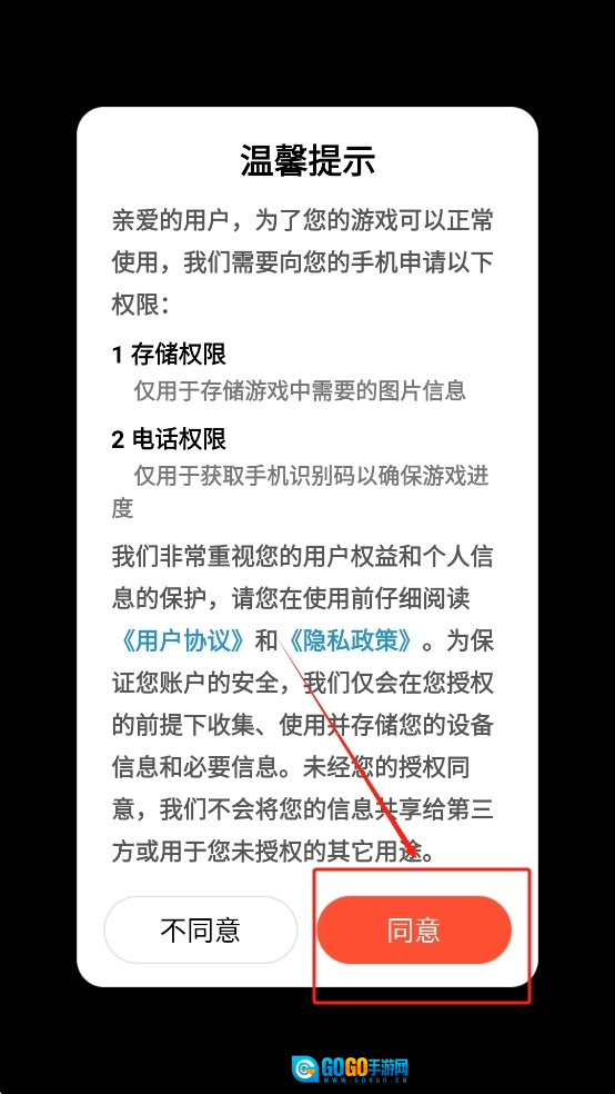 1、同意游戏权限申请,点击“同意”按钮。