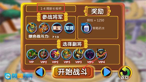 1、在1-4喝断长板桥关卡界面,关注参战将军综合战斗力-713,选择副将后点击开始战斗,通关可获铜钱+1250-策略药水奖励。