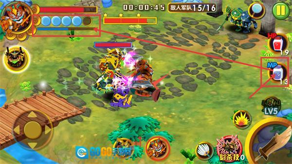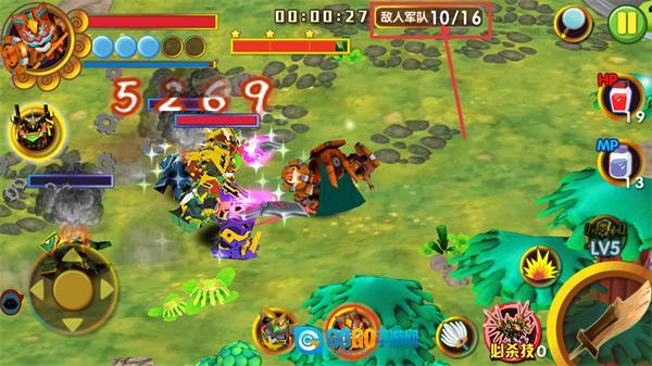 2、战斗时留意敌人军队-10/16进度,用方向控件操控角色,借助HP-9与MP-3道具续航,召唤副将协助作战。