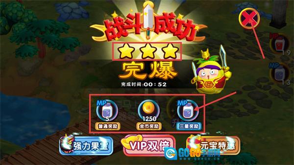 4、战斗成功获三星完爆评级,完成时间-00:52,领取普通奖励-MP5、金币奖励-1250与三星奖励,可通过强力果宝强化战力。