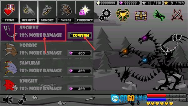 1、选择【ANCIENT】流派后点击【CONFIRM】,可获得【20%-MORE-DAMAGE】加成,提升输出能力,助力高难关卡。