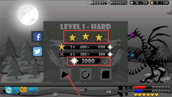 4、通关【LEVEL-1-HARD】并获得三星评价,可领取【2000星级奖励】,点击箭头按钮继续挑战更高难度关卡。