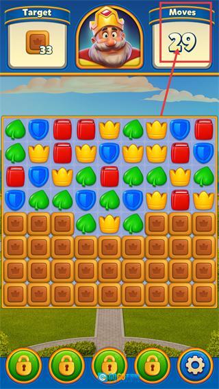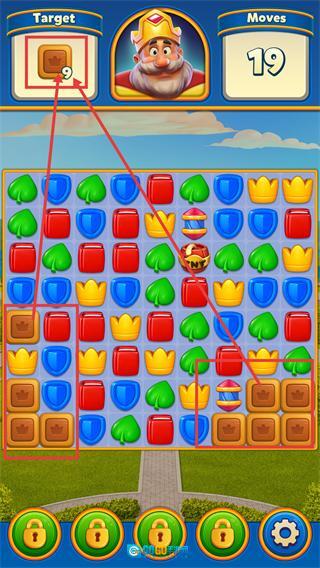 3、当【皇冠方块】数量剩余【9】时,聚焦其所在区域的消除操作,利用特效道具加速收集。