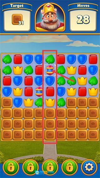 2、合成【竖列特效道具】后,使用它可消除整列元素,快速减少下方皇冠方块的遮挡障碍。