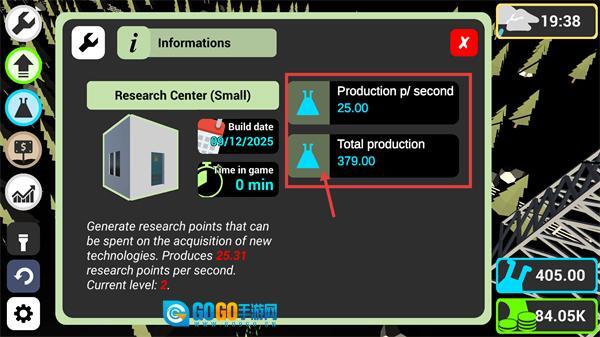 4、打开【Informations】界面,查看【Research-Center-(Small)】数据,其每秒产25.00-研究点,总产量达379.00,掌握设施产出状态。