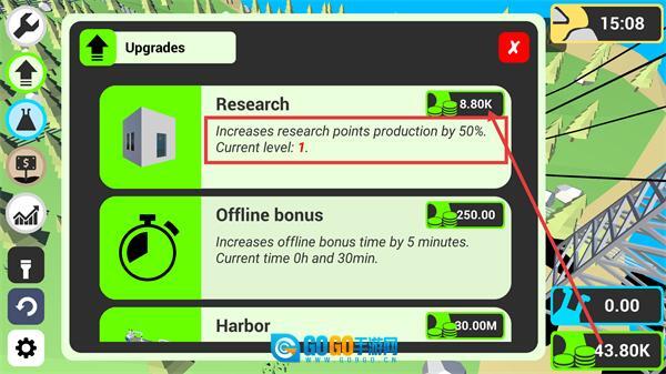 1、进入【Upgrades】界面,优先选择【Research】升级项,消耗8.80K-资源,可提升研究点产量50%,当前等级为1,助力科技解锁。