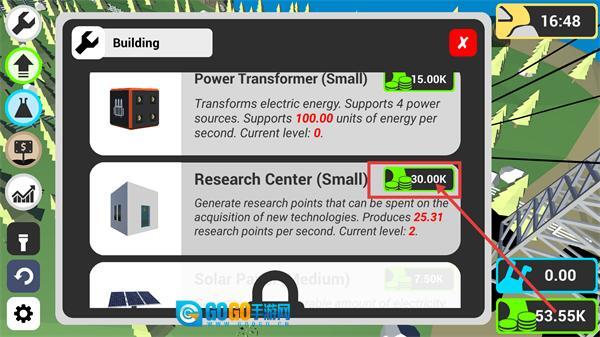 2、在【Building】界面,解锁【Research-Center-(Small)】需消耗30.00K-资源,其每秒产25.31-研究点,当前等级为2,强化研究效率。
