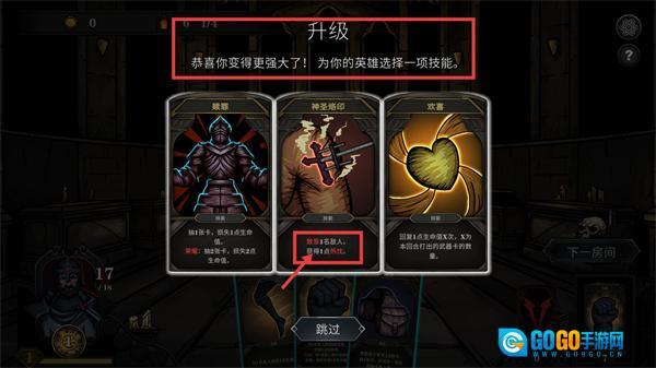 4、在升级环节会弹出【恭喜你变得更强了!请为你的英雄挑选一项技能】的提示,需要从【殉道】【刺穿伤口】【欢喜】这几个技能中选择其一,以增强英雄的能力。