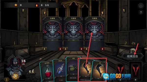 战斗过程中会遇到多个【石海魔】敌人,你可以用手牌里的攻击类卡牌去攻击它们,要注意关注自己的状态,并在合适的时候点击【结束回合】。