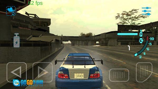 进入游戏后有两种模式可供切换,当前模式下,玩家可通过左右晃动手机来控制车辆方向,右下角按键用于加速,左下角按键则是刹车功能。