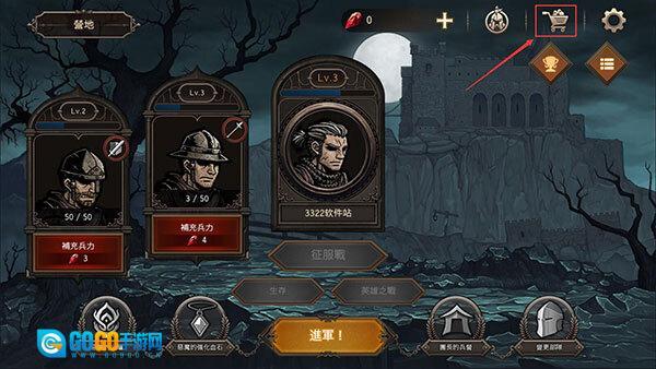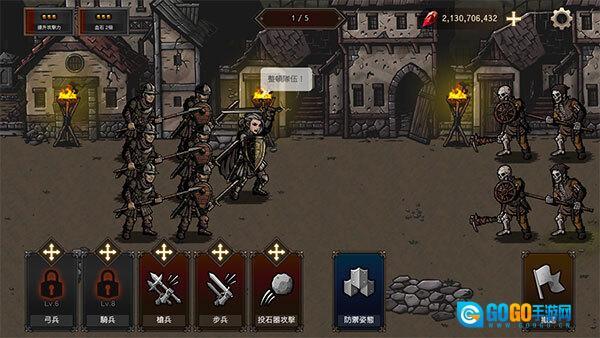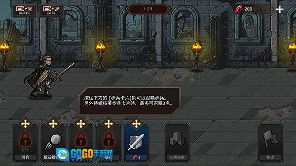 1、开启国王之血防御功能,第一步我们要进入教学关卡,按照指引逐步熟悉游戏的操作方式。按住下方的步兵卡片就能召唤步兵,若持续按住该卡片,最多可以召唤3名步兵。