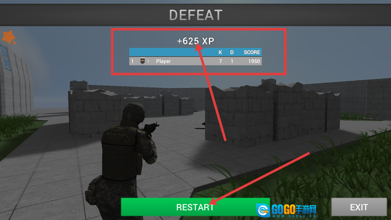 4、要是战斗没能获胜,依然能得到经验值(例如+625XP),点击【RESTART】按钮重新发起挑战,借此持续提升战斗技能。