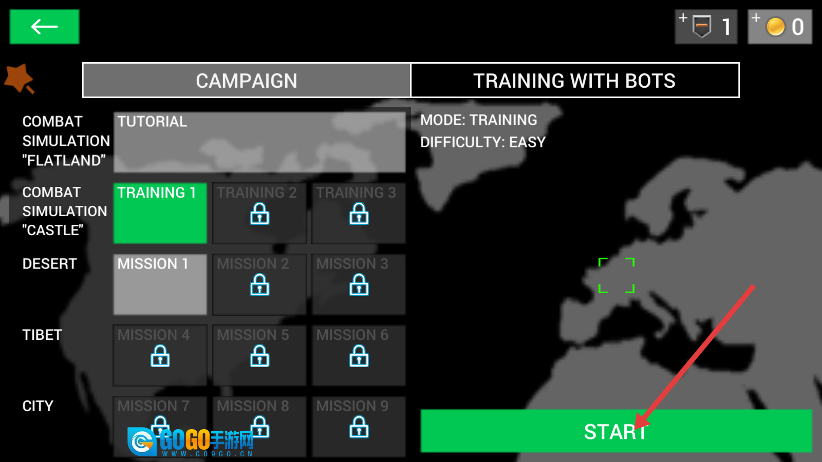 1、进入训练模式界面后,选择【TRAINING1】选项,点击【START】按钮,即可开启城堡场景的战斗训练,以此熟悉游戏的各项机制。