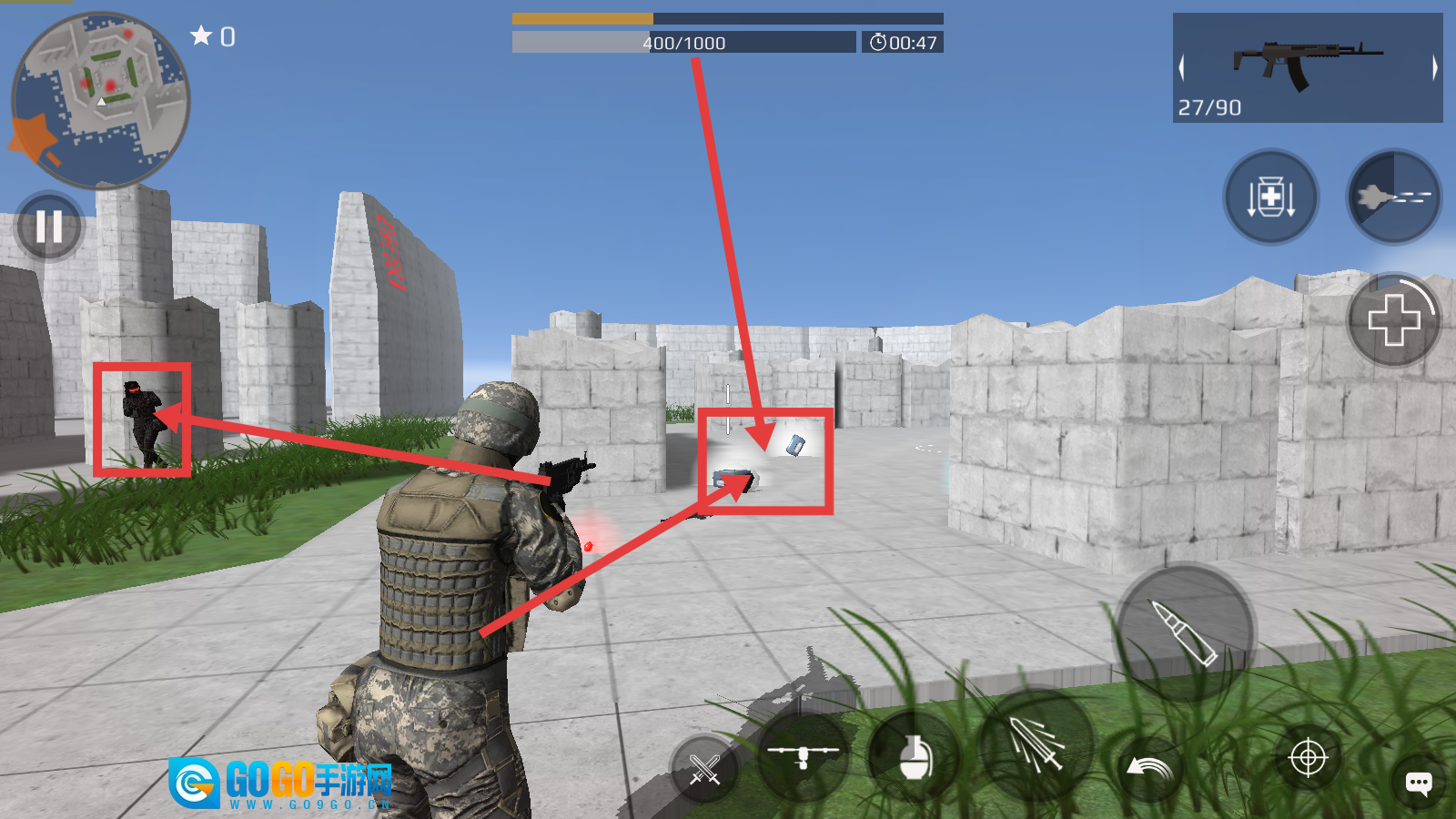 3、战斗时攻击敌方士兵,拾取战场道具,累积分数(例如400/1000),提高战斗效率。