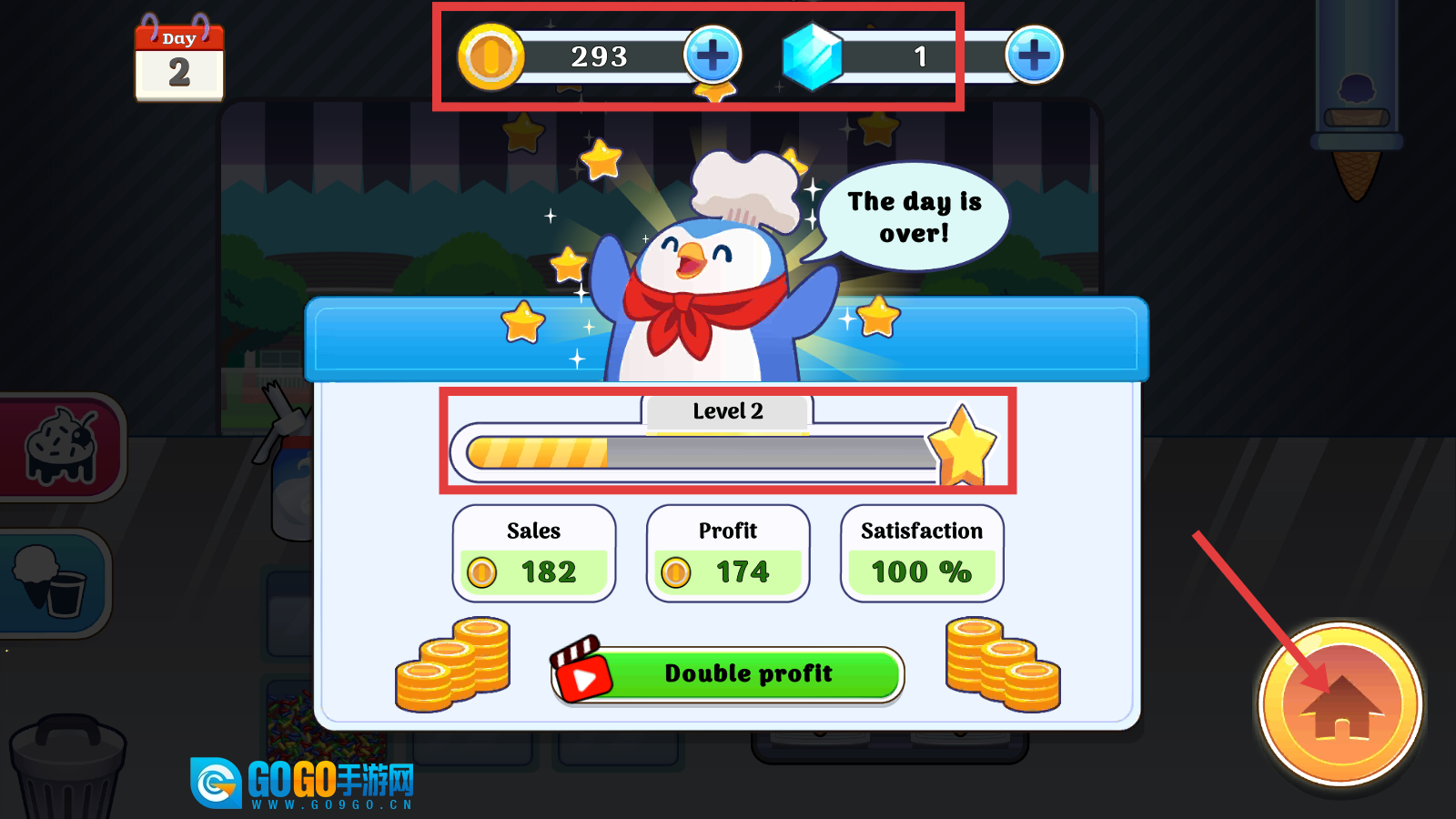 4、每日经营结束后,能获取【金币】【钻石】并提升等级,查看【Sales】【Profit】等数据后,可使用双倍收益功能,也能点击按钮回到主界面。