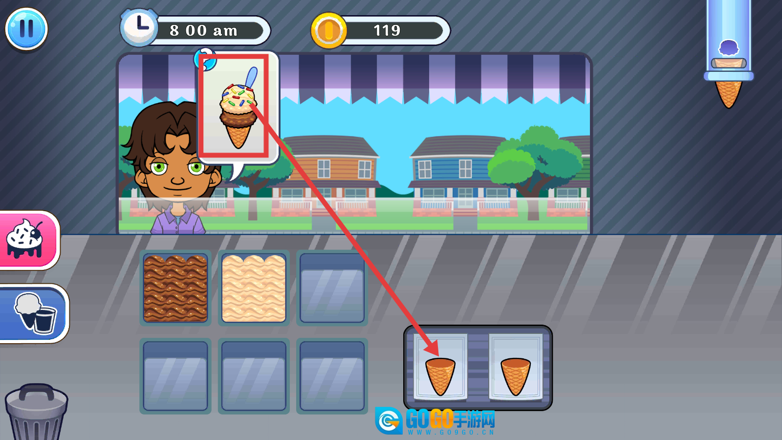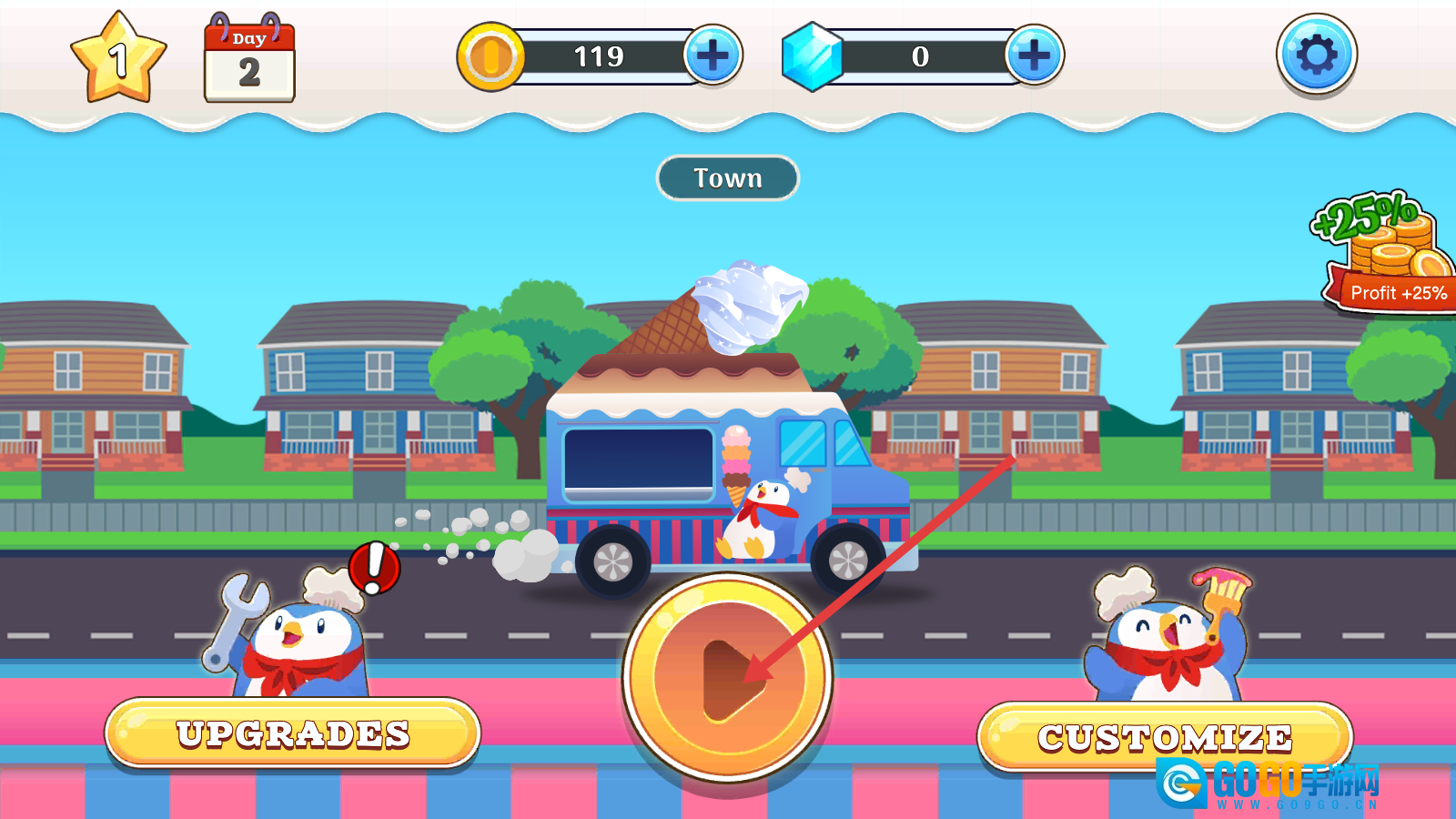 进入游戏后,建议先熟悉【UPGRADES】(升级)和【CUSTOMIZE】(自定义)功能,之后点击中间的播放按钮,就能在【Town】(小镇)场景中经营冰淇淋车,开启你的赚钱之旅了。