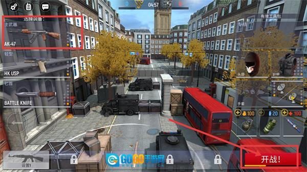 1、挑选【主武器-AK-47】,在确认完成装备后点击【开战!】按钮,即可进入城市场景展开战斗。